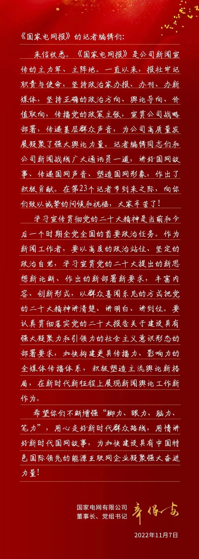 在第23個(gè)中國(guó)記者節(jié)到來(lái)之際,11月7日,國(guó)家電網(wǎng)有限公司董事長(zhǎng)、黨組書(shū)記辛保安給《國(guó)家電網(wǎng)報(bào)》的記者編輯回信,要求認(rèn)真學(xué)習(xí)宣傳貫徹黨的二十大精神,不斷增強(qiáng)腳力、眼力、腦力、筆力,用心走好新時(shí)代群眾路線,用情講好新時(shí)代國(guó)網(wǎng)故事,為加快建設(shè)具有中國(guó)特色國(guó)際領(lǐng)先的能源互聯(lián)網(wǎng)企業(yè)凝聚強(qiáng)大奮進(jìn)力量。