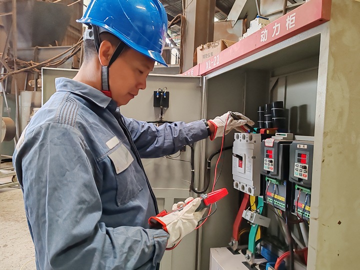 圖為南方電網(wǎng)興仁供電局工作人員對(duì)中義新能源燃燒顆粒廠(chǎng)配電設(shè)施進(jìn)行電壓負(fù)荷測(cè)量,制定“錯(cuò)峰用電優(yōu)化方案”。新能源燃燒顆粒在制作中對(duì)于持續(xù)粉碎、溫控烘干、聚米成粒的工業(yè)流程要求很高,長(zhǎng)時(shí)間高負(fù)荷運(yùn)轉(zhuǎn)的機(jī)械設(shè)備和用電高峰期的電壓穩(wěn)定性及電價(jià)成本成了該企業(yè)的一個(gè)生產(chǎn)痛點(diǎn)。
