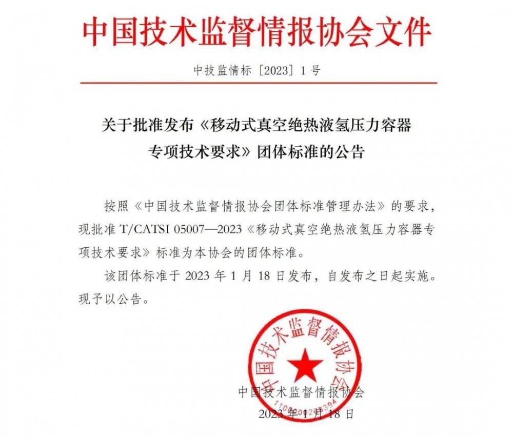 近日,中國技術(shù)監(jiān)督情報協(xié)會正式發(fā)布T/CATSI 05007—2023《移動式真空絕熱液氫壓力容器專項技術(shù)要求》團(tuán)體標(biāo)準(zhǔn)(以下簡稱“標(biāo)準(zhǔn)”),自發(fā)布之日起正式實施。該標(biāo)準(zhǔn)由中集安瑞科旗下南通中集能源裝備有限公司(簡稱”南通能源“)牽頭起草。