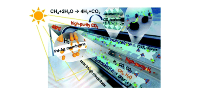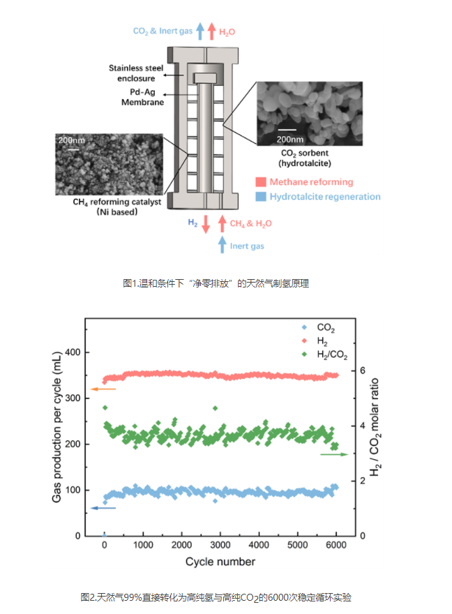 中國科學院工程熱物理研究所首次實現了400°C溫和條件下“凈零排放”的天然氣制氫原理突破。通過有序分離氫氣和二氧化碳產物,天然氣制氫反應溫度由傳統(tǒng)的800-1000°C降至400°C以下,實現了99%以上甲烷直接轉化為高純氫與高純二氧化碳,并實現了基于化石能源的制氫與脫碳的完全協同。制氫與脫碳能耗下降幅度達20-40%。基于此,該工作結合商業(yè)化中溫槽式聚光技術,實現了太陽能驅動的天然氣制氫與脫碳,進一步減少化石能源制氫的碳足跡,展示了化石能源與可再生能源互補實現可持續(xù)氫能利用的可行性。反應溫度的降低使工業(yè)余熱與氫能的結合成為可能。迄今為止,研究人員已完成了超過6000次的穩(wěn)定循環(huán)實驗,驗證了該方法的可靠性,并初步展示了技術轉化應用的廣闊前景。