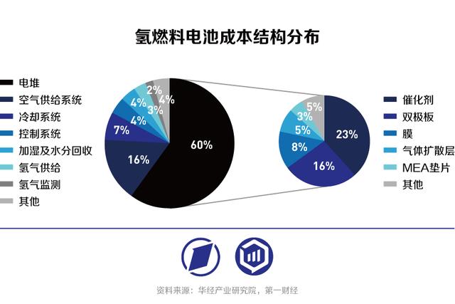 和鋰電、光伏產(chǎn)業(yè)相似,燃料電池走向大規(guī)模市場化的主要路徑是降低成本。根據(jù)華經(jīng)產(chǎn)業(yè)研究院數(shù)據(jù),氫燃料電池成本構(gòu)成中,電堆是最大構(gòu)成部分,占比約60%;在電堆成本構(gòu)成中,催化劑、雙極板和交換膜是主要成本來源,占總?cè)剂想姵爻杀颈壤謩e為23%、16%和8%。