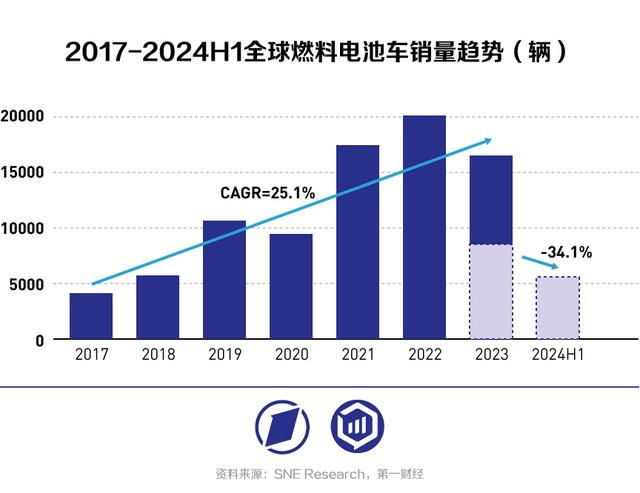氫燃料電池車作為現(xiàn)階段燃料電池系統(tǒng)的主要應(yīng)用領(lǐng)域,二者表現(xiàn)高度相關(guān)。全球氫燃料電池車在2023年和2024年上半年銷量均出現(xiàn)收縮趨勢。根據(jù)SNE Research的數(shù)據(jù),2022年氫燃料電池車全球銷售20704輛,創(chuàng)歷史新高,此后開始走低;2023年降至16413輛,同比下滑20.7%;2024年上半年該數(shù)字為5621輛,同比下滑34.1%。