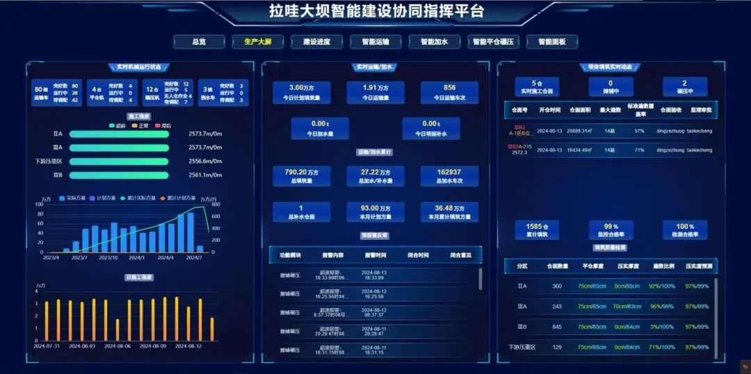 為保障世界級工程高效率高質(zhì)量建設,項目團隊不斷優(yōu)化施工規(guī)劃,全面應用無人碾壓、智能物料、智能加水、智能攤鋪等技術聯(lián)動的智慧大壩協(xié)同指揮平臺,全方位提升大壩填筑效率與質(zhì)量。截至目前,拉哇水電站大壩日填筑方量已突破3萬方,月填筑方量接近100萬方,月上升高度超過13.2米,為目前國內(nèi)上升速度最快的混凝土面板堆石壩。
