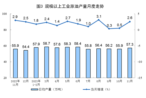 原油生產(chǎn)增速加快,進(jìn)口增速由增轉(zhuǎn)降。11月份,生產(chǎn)原油1720萬噸,同比增長2.6%,增速比10月份加快2.1個(gè)百分點(diǎn),日均產(chǎn)量57.3萬噸。進(jìn)口原油4245萬噸,同比下降9.2%,10月份為增長13.6%。