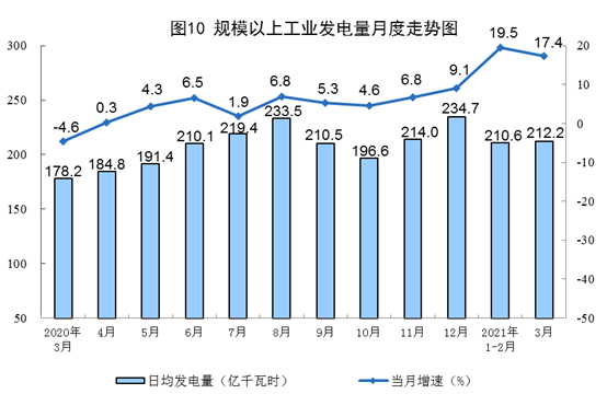 電力生產(chǎn)增長(zhǎng)較快。3月份,發(fā)電6579億千瓦時(shí),同比增長(zhǎng)17.4%,比2019年3月份增長(zhǎng)12.0%,兩年平均增長(zhǎng)5.8%,日均發(fā)電212.2億千瓦時(shí)。一季度,發(fā)電19051億千瓦時(shí),同比增長(zhǎng)19.0%,比2019年一季度增長(zhǎng)10.8%,兩年平均增長(zhǎng)5.3%。
