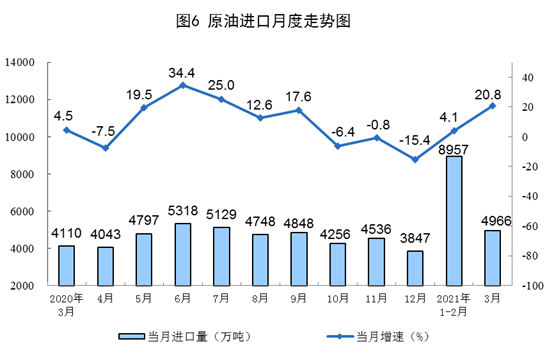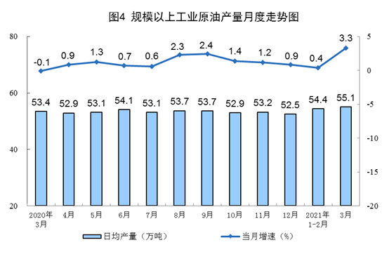 原油生產(chǎn)加快,加工量較快增長(zhǎng)。3月份,生產(chǎn)原油1709萬(wàn)噸,同比增長(zhǎng)3.3%,比2019年3月份增長(zhǎng)3.3%,兩年平均增長(zhǎng)1.6%,日均產(chǎn)量55.1萬(wàn)噸。加工原油5979萬(wàn)噸,同比增長(zhǎng)19.7%,比2019年3月份增長(zhǎng)11.8%,兩年平均增長(zhǎng)5.8%,日均加工192.9萬(wàn)噸。