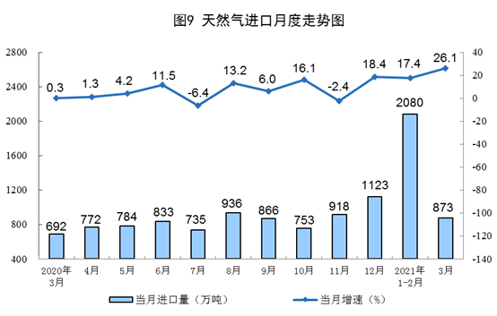 天然氣進(jìn)口大幅增長(zhǎng)。3月份,進(jìn)口天然氣873萬(wàn)噸,同比增長(zhǎng)26.1%。一季度,進(jìn)口天然氣2939萬(wàn)噸,同比增長(zhǎng)19.6%。