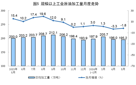原油生產(chǎn)平穩(wěn)增長(zhǎng),進(jìn)口由增轉(zhuǎn)降。5月份,規(guī)上工業(yè)原油產(chǎn)量1815萬(wàn)噸,同比增長(zhǎng)0.6%,增速比4月份放緩0.7個(gè)百分點(diǎn);日均產(chǎn)量58.5萬(wàn)噸。進(jìn)口原油4697萬(wàn)噸,同比下降8.7%。