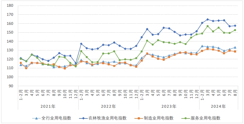 8月,農(nóng)林牧漁業(yè)用電指數(shù)為157.5,比2020年基期增長(zhǎng)了57.5%,年均增長(zhǎng)12.0%,同比增長(zhǎng)4.6%,同比增速比上月回升3.1個(gè)百分點(diǎn)。