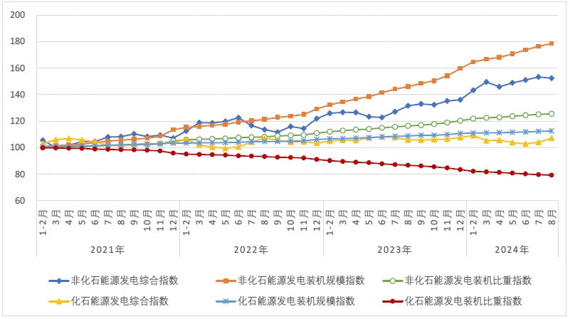 2024年8月,非化石能源發(fā)電綜合指數(shù)為152.4,比2020年基期增長了52.4%,同比增長15.9%;其中,新能源發(fā)電綜合指數(shù)為215.9,比2020年基期增長了115.9%,同比增長27.9%。在“雙碳”目標(biāo)引領(lǐng)下,非化石能源發(fā)電綜合指數(shù)快速增長。其中: