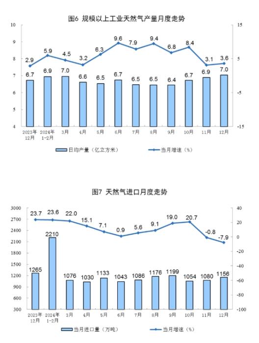 天然氣生產(chǎn)穩(wěn)步增長。12月份,規(guī)上工業(yè)天然氣產(chǎn)量218億立方米,同比增長3.6%,增速比11月份加快0.5個百分點(diǎn);日均產(chǎn)量7.0億立方米。進(jìn)口天然氣1156萬噸,同比下降7.9%。