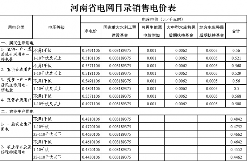 二、自2021年10月15日起,全面取消工商業(yè)目錄銷售電價(jià),僅保留居民生活、農(nóng)業(yè)生產(chǎn)目錄銷售電價(jià),調(diào)整后的河南省電網(wǎng)目錄銷售電價(jià)見附件1。執(zhí)行兩部制電價(jià)的工商業(yè)用戶,基本電價(jià)仍按國(guó)家現(xiàn)行有關(guān)規(guī)定執(zhí)行。