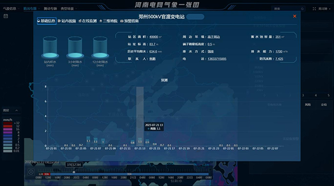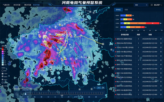 “一張圖”建設(shè)以電網(wǎng)氣象災(zāi)害風(fēng)險預(yù)報預(yù)警模型為核心,集夏季防汛、冬季覆冰舞動、春秋季風(fēng)災(zāi)等多種電網(wǎng)氣象災(zāi)害風(fēng)險預(yù)報預(yù)警于一體,預(yù)警信息的地理精度可具體到變電站、線路桿塔。通過平臺可實時捕捉電網(wǎng)設(shè)備的氣象要素監(jiān)測和預(yù)報信息,以及變電站周邊環(huán)境監(jiān)控等。當(dāng)出現(xiàn)重大天氣過程時,平臺根據(jù)不同風(fēng)險等級預(yù)測,動態(tài)提供“一站一策式”的24小時、72小時內(nèi)應(yīng)對措施建議。