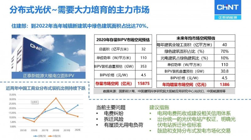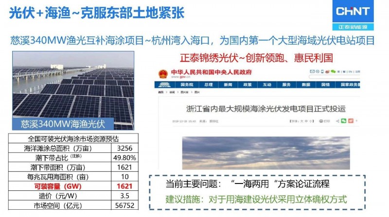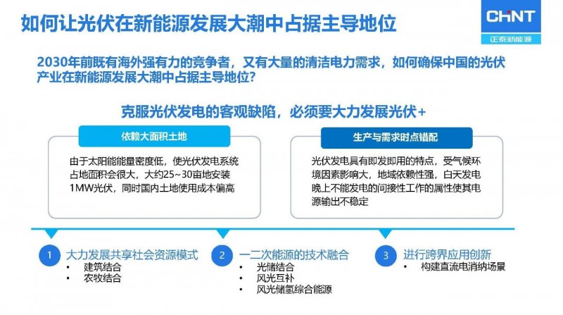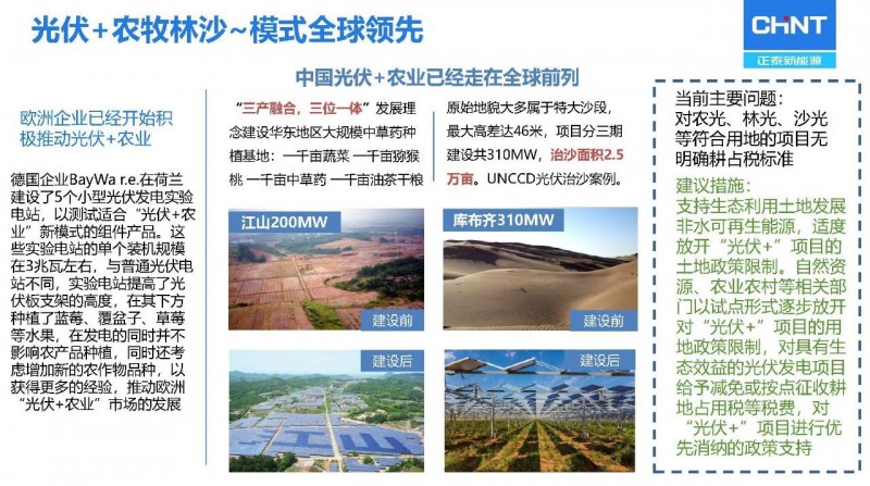 2021年2月3日,由中國光伏行業(yè)協(xié)會主辦的“光伏行業(yè)2020年發(fā)展回顧與2021年形勢展望網(wǎng)絡(luò)研討會”上,浙江正泰新能源開發(fā)有限公司總裁陸川針對我國目前光伏+融合發(fā)展模式趨勢進(jìn)行了分析。我國已經(jīng)走在了全球光伏+農(nóng)業(yè)行業(yè)的前列,針對農(nóng)光互補電站,他希望能夠推動自上而下的關(guān)于農(nóng)光互補設(shè)施正常補償機(jī)制的兌現(xiàn)以促進(jìn)行業(yè)更優(yōu)發(fā)展。光伏+海漁的合作方式適用于我國東南海岸,克服了東部土地緊張,不但能夠產(chǎn)生發(fā)電效益,同時還能產(chǎn)生漁業(yè)收益。光伏+儲能、光伏+風(fēng)電、光伏+制氫等均為我國光伏應(yīng)用新模式做出突出貢獻(xiàn)。戶用光伏的智能化應(yīng)用、光伏+信號基站的互補應(yīng)用、光伏+交通實現(xiàn)綠電出行等跨界創(chuàng)新的光伏應(yīng)用模式也將逐漸推廣,實現(xiàn)全社會層面的綠電應(yīng)用。
