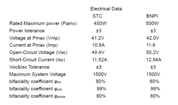 雙面銘牌輻照度(BNPI)定義為:組件正面接收1000w/m²輻照度同時背面接收135w/m²輻照度下的電性能,除了輻照度其他測試條件和STC一致,等效輻照度GE=1000w/m²+φ*135w/m²。