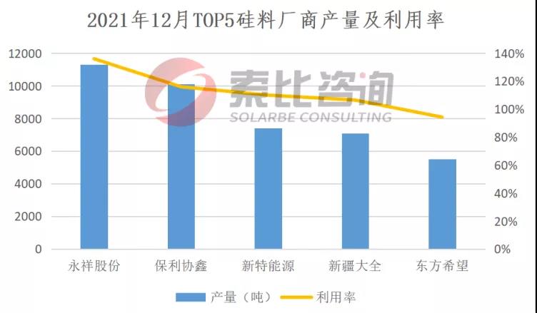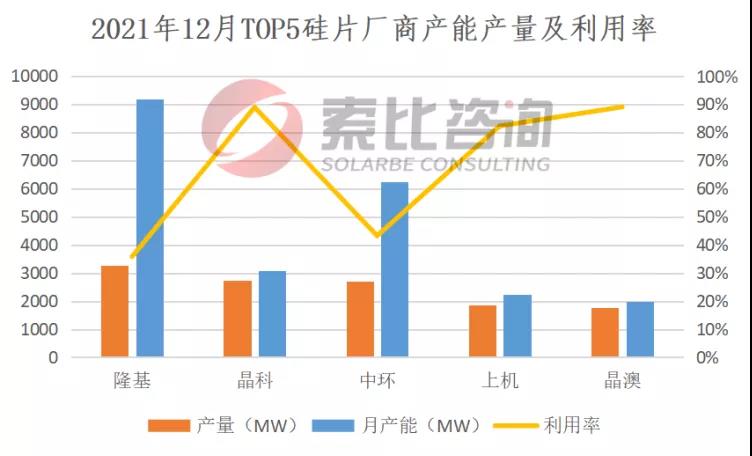 根據(jù)索比咨詢統(tǒng)計(jì),2021年12月,前五大硅料企業(yè)總產(chǎn)量4.14萬(wàn)噸,綜合產(chǎn)能利用率112.6%。硅片方面,兩家頭部企業(yè)開(kāi)工率回至50%以上,一體化企業(yè)開(kāi)工率相對(duì)較高。去年12月,國(guó)內(nèi)硅片產(chǎn)量17.85GW,環(huán)比下降8.6%。按照產(chǎn)量排名,隆基、晶科、中環(huán)、上機(jī)、晶澳位列前五,總產(chǎn)量12.35GW,占比69.19%,綜合利用率67.81%。雖然有觀點(diǎn)認(rèn)為,中環(huán)的實(shí)際產(chǎn)能利用率要高于上述數(shù)據(jù),但總體看,產(chǎn)業(yè)鏈上游價(jià)格居高不下,已經(jīng)影響到終端需求,并反作用于上游。