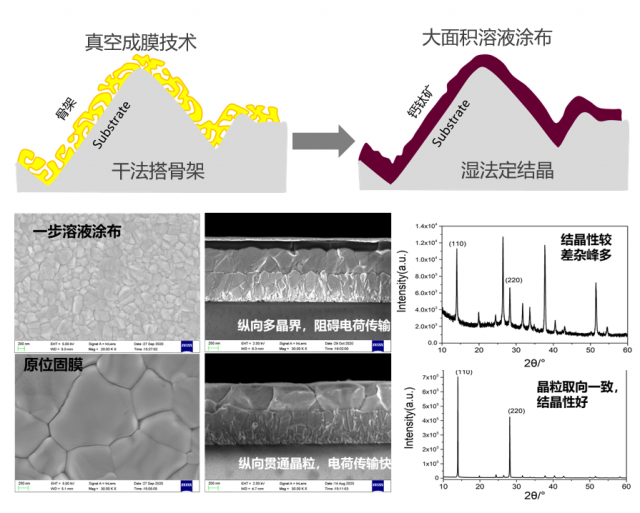 對于鈣鈦礦產(chǎn)業(yè)化技術研發(fā)而言,鈣鈦礦膜層的大面積制備極為重要。當前常用的大面積膜層制備技術為“一步溶液涂布法”,但在這種制備工藝過程中,溶劑的揮發(fā)、化學鍵的形成、材料的形核與結(jié)晶生長等各種化學反應和物理過程同步發(fā)生,而且留給上述各種反應過程的時間窗口極短,受環(huán)境影響大,在未來大面積規(guī)模化生產(chǎn)時會遇到工藝窗口窄的問題,不利于良率的提升。