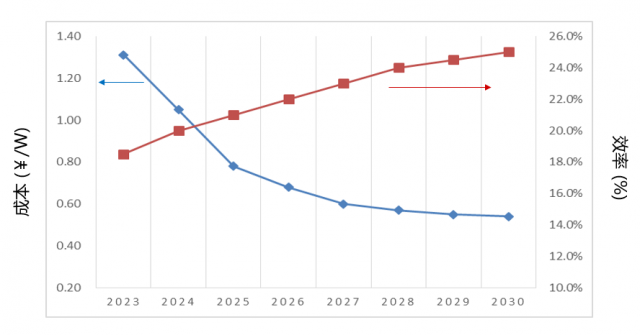 根據(jù)數(shù)據(jù)測算,到2023年平米級鈣鈦礦光伏產(chǎn)品將實現(xiàn)17-19%的效率,后續(xù)持續(xù)提升至25%。百兆瓦級產(chǎn)線階段成本也將控制在1.0-1.5¥/W之間;1GW級時能降到~0.8¥/W;10GW級降到~0.6¥/W??紤]到鈣鈦礦組件成本較低,如果其效率達到17%,價格達到1.3¥/W,壽命25年時,就擁有市場競爭力。