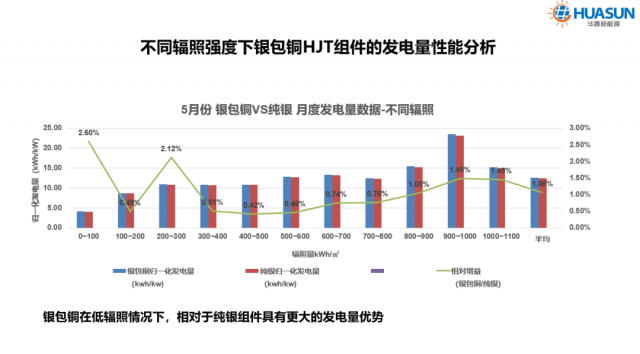 王文靜博士介紹,華晟的異質(zhì)結(jié)技術(shù)已經(jīng)發(fā)展至3.0階段,實(shí)現(xiàn)了雙面微晶異質(zhì)結(jié)電池的量產(chǎn),并通過(guò)銀包銅、0BB、電鍍銅等工藝,在保障產(chǎn)品可靠性的同時(shí)持續(xù)推動(dòng)異質(zhì)結(jié)降本。去年下半年,公司已在異質(zhì)結(jié)電池的背面副柵中導(dǎo)入了銀包銅漿料,從測(cè)試數(shù)據(jù)來(lái)看,銀包銅組件較純銀組件仍有超1%的發(fā)電量增益,且這一發(fā)電量?jī)?yōu)勢(shì)在高溫與低輻照環(huán)境下更加明顯。