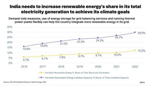 該報(bào)告聲稱,在2016年至2022年期間,印度安裝的可再生能源發(fā)電設(shè)施裝機(jī)容量在其印度總能源結(jié)構(gòu)中的份額僅增長了6.5%。但同期可再生能源發(fā)電量的份額增長了13.6%。印度正在迅速開發(fā)可再生能源,其速度快于化石燃料發(fā)電設(shè)施,但需要開發(fā)更多的可再生能源以實(shí)現(xiàn)其氣候目標(biāo)。
