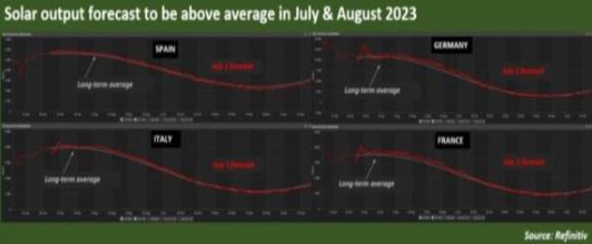 Refinitiv(路孚特,倫敦證券交易所集團(tuán)旗下企業(yè),是全球最大的金融市場(chǎng)數(shù)據(jù)和基礎(chǔ)設(shè)施提供商之一)對(duì)國(guó)家級(jí)太陽(yáng)能產(chǎn)量的預(yù)測(cè)顯示,西班牙、德國(guó)、法國(guó)和意大利的產(chǎn)量將遠(yuǎn)高于長(zhǎng)期平均水平——所有主要太陽(yáng)能生產(chǎn)國(guó)最近幾周都經(jīng)歷了持續(xù)炎熱的天氣。