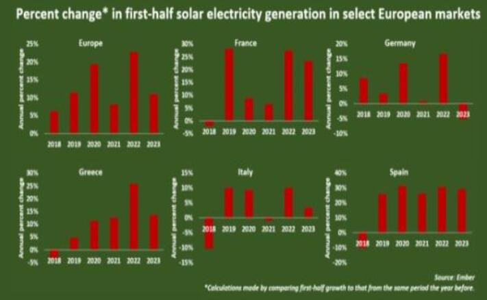 部分歐洲市場(chǎng)上半年太陽(yáng)能發(fā)電量