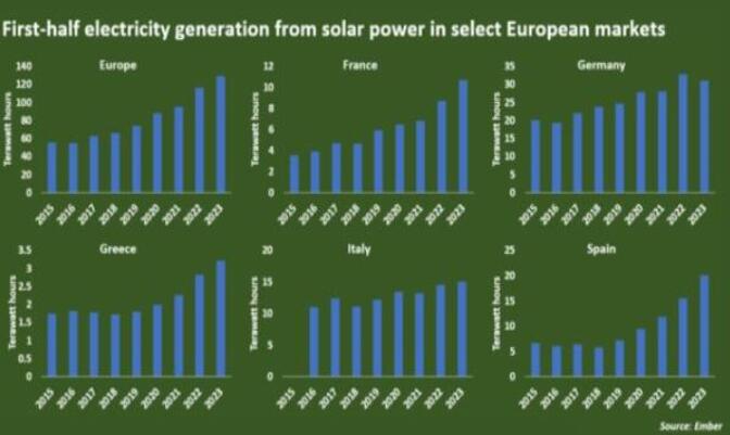 據(jù) Ember(Ember是一個(gè)獨(dú)立能源智庫(kù),旨在通過(guò)數(shù)據(jù)和分析,推動(dòng)世界向清潔電力轉(zhuǎn)型。) 稱,今年上半年歐洲太陽(yáng)能發(fā)電量較 2022年同期,增長(zhǎng)了近 11%,達(dá)到創(chuàng)紀(jì)錄的 129.2 太瓦時(shí)。