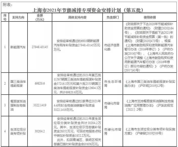 1、按照《財政部關于下達2020年節(jié)能減排補助資金預算的通知》(財建[2020]164號)、《財政部關于提前下達2021年節(jié)能減排補助資金預算(第一批)的通知》(財建[2020]473號),根據(jù)《上海市鼓勵購買和使用新能源汽車暫行辦法(2016年修訂)》(滬府辦發(fā)[2016]7號)、《上海市人民政府辦公廳關于調整〈上海市鼓勵購買和使用新能源汽車暫行辦法(2016年修訂)部分內(nèi)容的通知〉》(滬府辦發(fā)[2017]41號)等規(guī)定,安排經(jīng)審核通過的6903輛新能源汽車購車補貼資金27948.43145萬元。