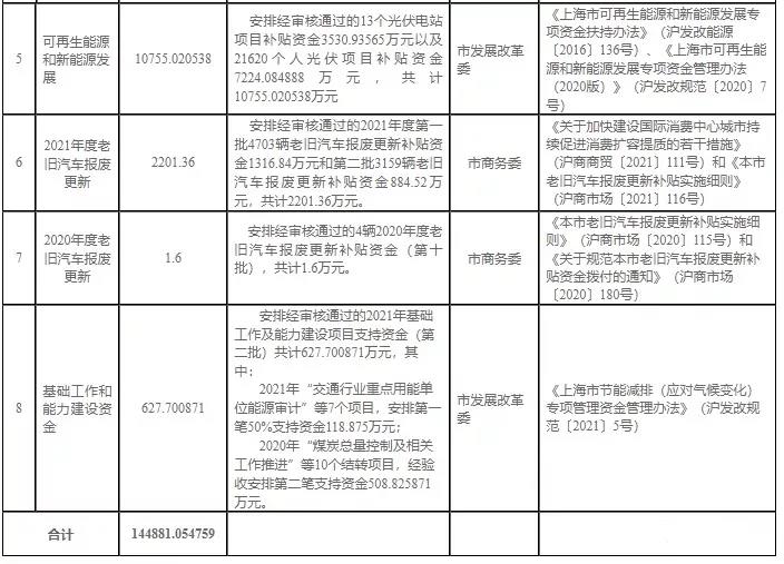 5、按照《上海市可再生能源和新能源發(fā)展專項資金扶持辦法》(滬發(fā)改能源〔2016〕136號)、《上海市可再生能源和新能源發(fā)展專項資金管理辦法(2020版)》(滬發(fā)改規(guī)范〔2020〕7號)等相關規(guī)定,安排經(jīng)審核通過的13個光伏電站項目以及21620個人光伏項目補貼資金,共計10755.020538萬元。