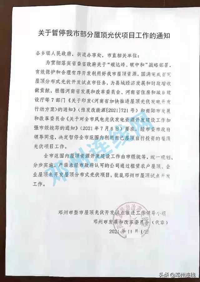 近日,有網(wǎng)友爆料稱,河南省鄧州市以整市屋頂光伏開(kāi)發(fā)試點(diǎn)推進(jìn)工作領(lǐng)導(dǎo)小組、市發(fā)改委的名義印發(fā)通知,暫停全市范圍內(nèi)利用自己屋頂自行投資的屋頂光伏項(xiàng)目工作。