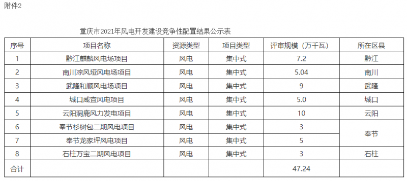 2.重慶市2021年風電開發(fā)建設(shè)競爭性配置結(jié)果公示表