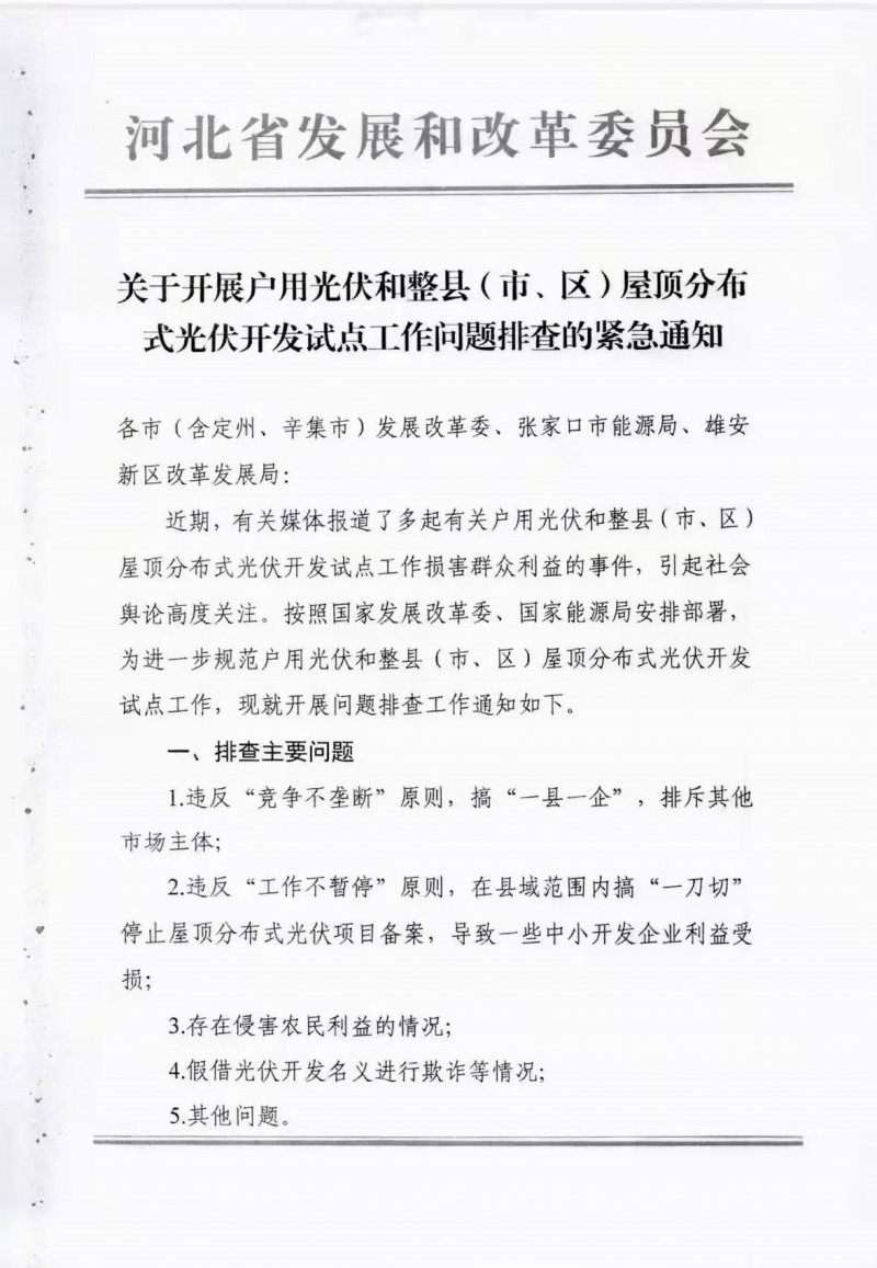 12月21日,河北省發(fā)改委下發(fā)《關(guān)于開(kāi)展戶(hù)用光伏和整縣(市、區(qū))屋頂分布式光伏開(kāi)發(fā)試點(diǎn)工作問(wèn)題排查的緊急通知》,文件指出:近期有關(guān)媒體報(bào)道多起有關(guān)戶(hù)用光伏和整縣(市、區(qū))屋頂分布式光伏開(kāi)發(fā)試點(diǎn)工作損害群眾利益的事件,引發(fā)社會(huì)輿論高度關(guān)注。按照國(guó)家發(fā)展改革委、國(guó)家能源局安排部署,為進(jìn)一步規(guī)范戶(hù)用光伏和整縣(市、區(qū))屋頂分布式光伏開(kāi)發(fā)試點(diǎn)工作,開(kāi)展問(wèn)題排查工作。有關(guān)排查工作情況,于12月28日上報(bào)。