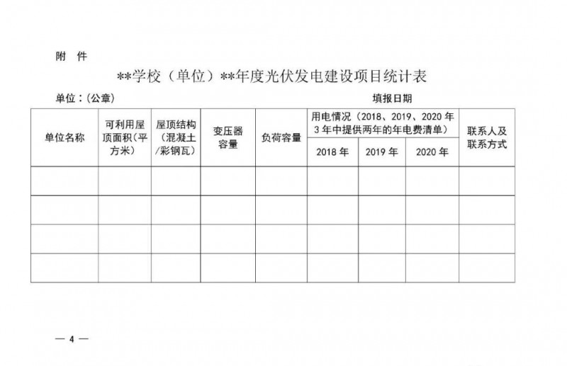 在“陽(yáng)光校園”工程實(shí)施期間,各高等學(xué)校、省屬中等職業(yè)學(xué)校、廳直屬單位(學(xué)校)擬開(kāi)展光伏發(fā)電項(xiàng)目建設(shè)的,請(qǐng)?zhí)顖?bào)《**學(xué)校(單位)**年度光伏發(fā)電建設(shè)項(xiàng)目統(tǒng)計(jì)表》,加蓋單位公章,于每年12月底前將下一年度實(shí)施計(jì)劃報(bào)送省教育廳發(fā)展規(guī)劃處,省教育廳將根據(jù)有關(guān)安排積極推進(jìn)“陽(yáng)光校園”工程。