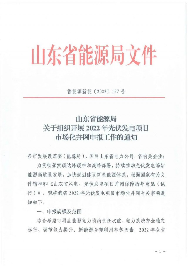 為貫徹落實碳達(dá)峰碳中和戰(zhàn)略部署,持續(xù)推動光伏發(fā)電等新能源高質(zhì)量發(fā)展,加快規(guī)劃建設(shè)新型能源體系,根據(jù)國家有關(guān)文件精神和《山東省風(fēng)電、光伏發(fā)電項目并網(wǎng)保障指導(dǎo)意見(試行)》,現(xiàn)將我省2022年光伏發(fā)電項目市場化并網(wǎng)有關(guān)事項通知如下: