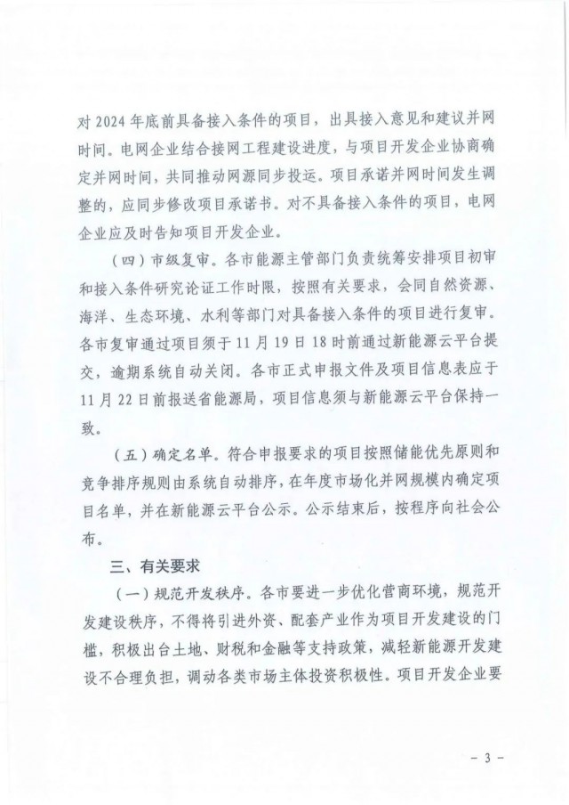 (四)市級復(fù)審。各市能源主管部門負(fù)責(zé)統(tǒng)籌安排項目初審和接入條件研究論證工作時限,按照有關(guān)要求,會同自然資源、海洋、生態(tài)環(huán)境、水利等部門對具備接入條件的項目進行復(fù)審。各市復(fù)審?fù)ㄟ^項目須于11月19日18時前通過新能源云平臺提交,逾期系統(tǒng)自動關(guān)閉。各市正式申報文件及項目信息表應(yīng)于11月22日前報送省能源局,項目信息須與新能源云平臺保持一致。