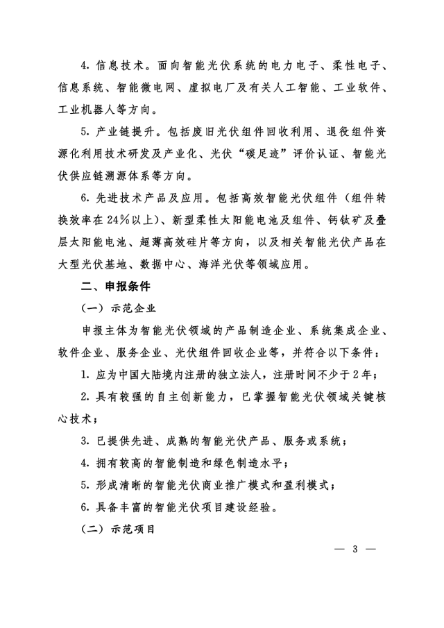 6.先進技術產品及應用。包括高效智能光伏組件(組件轉換效率在24%以上)、新型柔性太陽能電池及組件、鈣鈦礦及疊層太陽能電池、超薄高效硅片等方向,以及相關智能光伏產品在大型光伏基地、數(shù)據中心、海洋光伏等領域應用。
