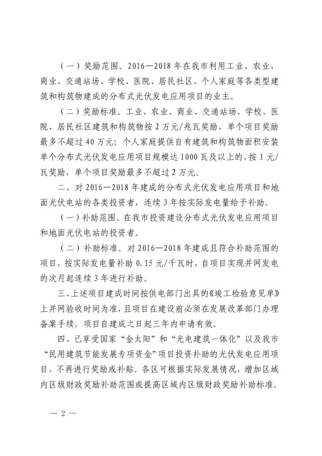 項目自建成并網的次月起連續(xù)補助36個月,其中:2017一2018年建成并網的分布式光伏發(fā)電項目,按實際發(fā)電量補助0.15元/千瓦時;2019-2020年建成并網的分布式光伏發(fā)電項目,按實際發(fā)電量補助0.3元/千瓦時。