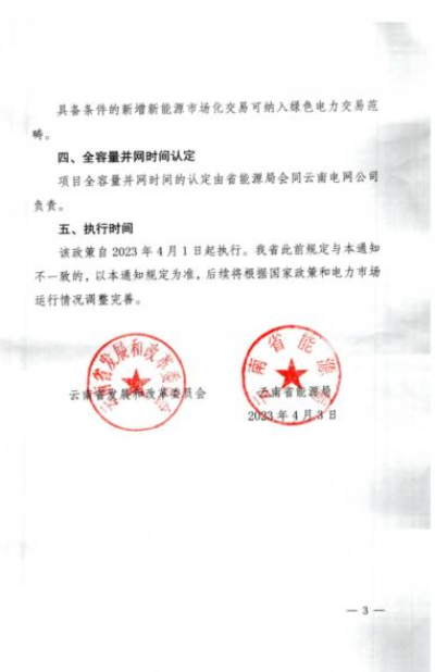 4月3日,云南省發(fā)展和改革委員會、云南省能源局發(fā)布了《關(guān)于云南省光伏發(fā)電上網(wǎng)電價政策有關(guān)事項的通知》。該政策自2023年4月1日起執(zhí)行。通知顯示,為進(jìn)一步發(fā)揮市場配置資源的決定性作用,促進(jìn)光伏發(fā)電產(chǎn)業(yè)健康有序發(fā)展,提升能源保供能力,云南省對新增合規(guī)光伏發(fā)電項目全電量納入市場統(tǒng)籌。