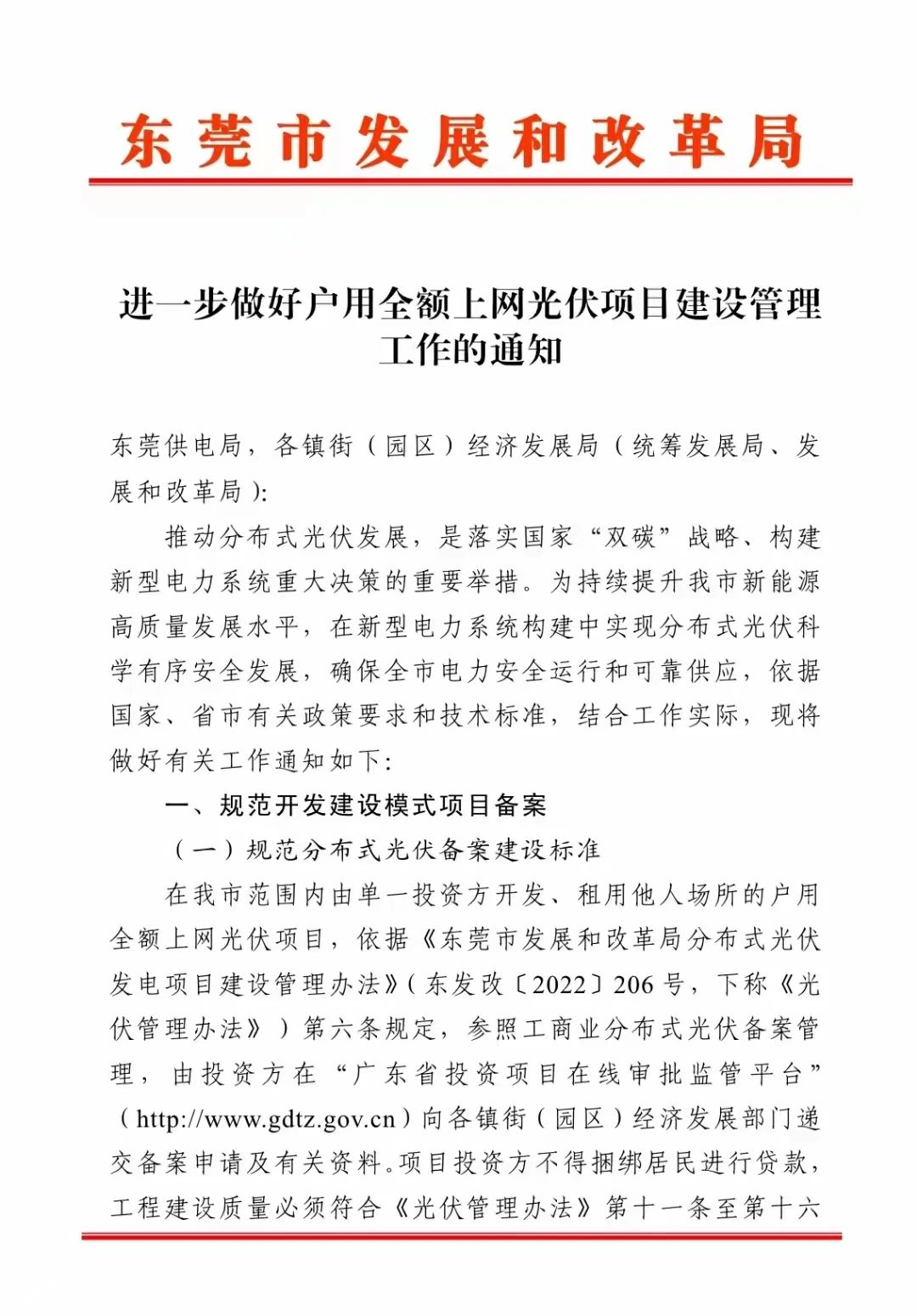 近日,東莞市發(fā)展和改革局下發(fā)了關(guān)于《進(jìn)一步做好戶用全額上網(wǎng)光伏項(xiàng)日建設(shè)管理工作的通知》