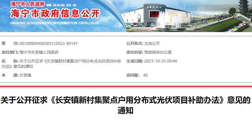 10月25日,浙江海寧市長安鎮(zhèn)人民政府關(guān)于公開征求《長安鎮(zhèn)新村集聚點(diǎn)戶用分布式光伏項(xiàng)目補(bǔ)助辦法》意見的通知。文件指出,為加快統(tǒng)籌推進(jìn)全鎮(zhèn)新村集聚點(diǎn)戶用分布式光伏項(xiàng)目建設(shè),特制《長安鎮(zhèn)新村集聚點(diǎn)戶用分布式光伏項(xiàng)目補(bǔ)助辦法》。