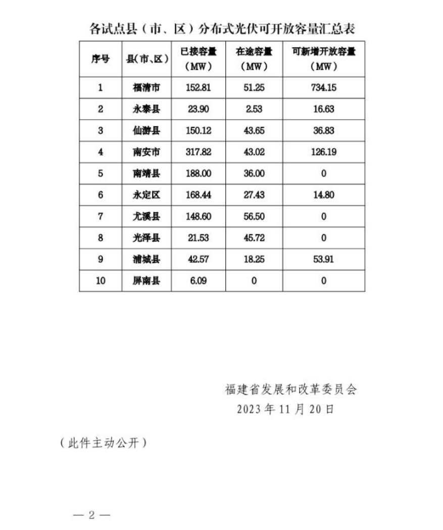 11月20日,福建省發(fā)展和改革委員會發(fā)布《關(guān)于發(fā)布試點縣分布式光伏接入電網(wǎng)承載力信息的通告》(下稱《通告》)。