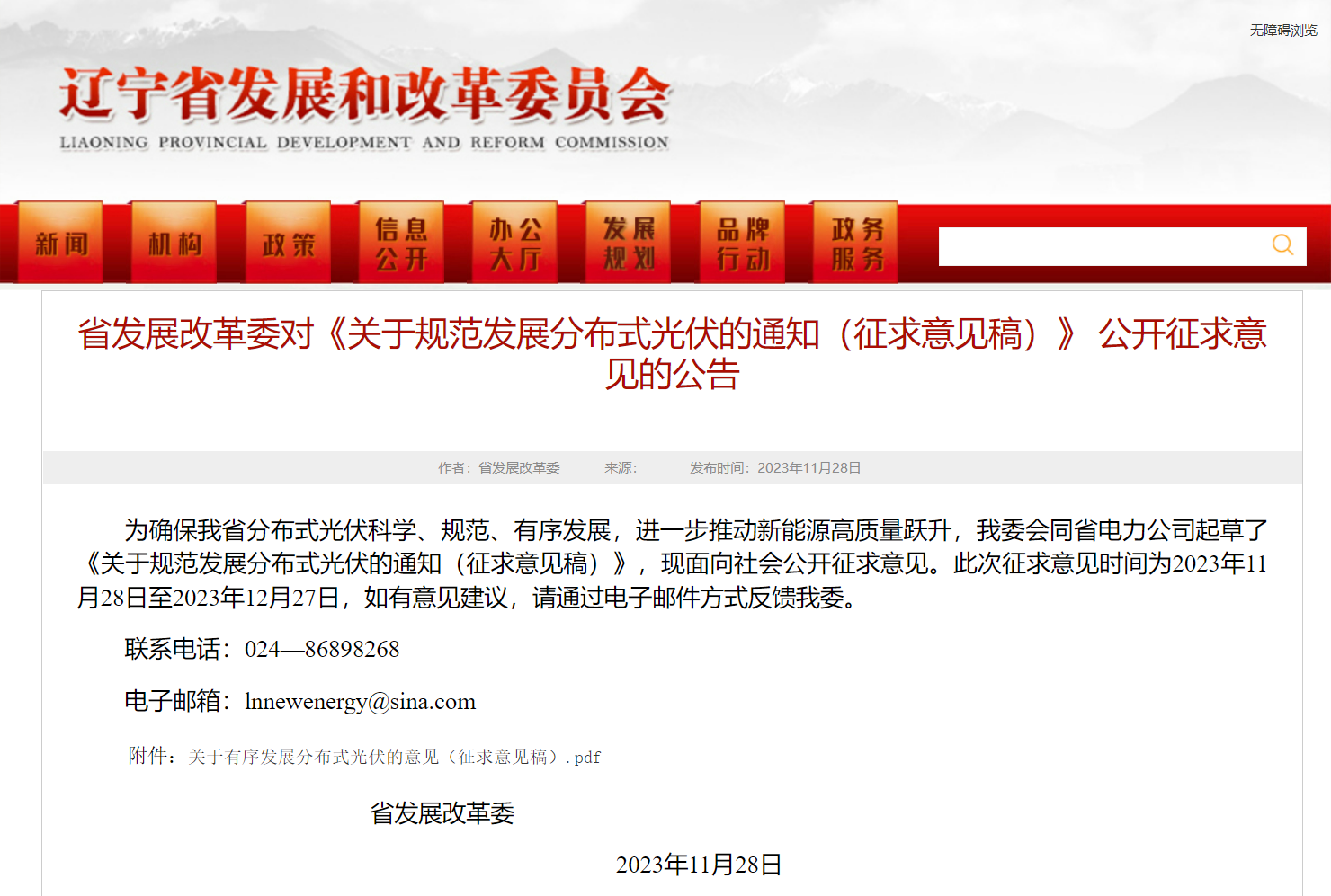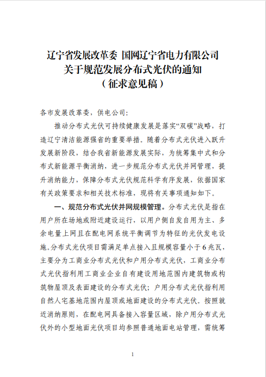 2023年11月28日,遼寧省發(fā)展改革委發(fā)布了關于規(guī)范發(fā)展分布式光伏的通知(征求意見稿)》 公開征求意見的公告。