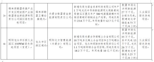 (四)明陽包頭市石拐工業(yè)園區(qū)350WM綠色供電項目。此本項目為變更項目,新增負荷內(nèi)蒙古華商稀土合金有限公司10萬噸多元稀土合金項目和2萬噸硼合金項目、包頭和順新材料有限責(zé)任公司1.1萬噸特種特合金項目等,用電負荷為18.2萬千瓦,年用電量10億千瓦時。配置市場化并網(wǎng)新能源35萬千瓦,其中風(fēng)電15萬千瓦、光伏20萬千瓦,配建電化學(xué)儲能5.25萬千瓦/4小時。