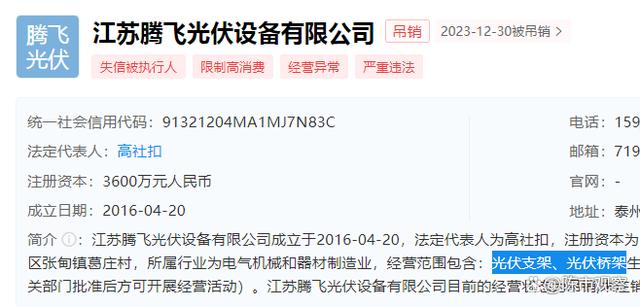 公開資料顯示,江蘇騰飛光伏設備有限公司于2016年注冊成立,距今已有8年時間。騰飛光伏主營業(yè)務為生產(chǎn)光伏組件,其中包括光伏支架、光伏橋架等產(chǎn)品的生產(chǎn)和銷售。有接近騰飛光伏的知情人士表示,騰飛光伏并非名不見經(jīng)傳的小工廠,而是曾位列全球出貨量前十的光伏組件工廠,2022年,騰飛光伏年產(chǎn)能高達20GW,生產(chǎn)的光伏組件熱銷歐洲、美洲、東南亞等。