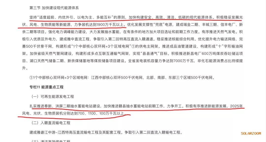 文件顯示,江西省將在“十四五”期間堅(jiān)持“適度超前、內(nèi)優(yōu)外引、以電為主、多能互補(bǔ)”的原則,加快構(gòu)建安全、高效、清潔、低碳的現(xiàn)代能源體系。積極穩(wěn)妥發(fā)展光伏、風(fēng)電、生物質(zhì)能等新能源,到2025年力爭裝機(jī)達(dá)到1900萬千瓦以上。其中,風(fēng)電、光伏、生物質(zhì)裝機(jī)分別達(dá)到700、1100、100萬千瓦以上。