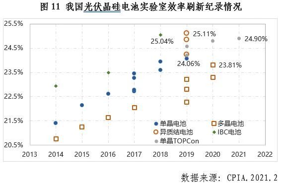 實驗室方面,2020年4月,晶科研發(fā)的多晶硅(Multicrystalline)電池片實驗室效率達(dá)到23.3%,并被收錄于NREL電池片轉(zhuǎn)換效率紀(jì)錄表中,隨后阿特斯宣布將該效率提高至23.81%。7月,晶科宣布其研發(fā)的N型單晶硅單結(jié)電池片效率達(dá)到24.79%,2021年1月,將該紀(jì)錄再次刷新到24.90%,創(chuàng)造了新的大面積N型單晶鈍化接觸電池片效率世界紀(jì)錄。我國除了在晶硅電池技術(shù)方面領(lǐng)先全球外,鈣鈦礦、有機電池等電池片實驗室效率也走在世界前列,2020年7月,杭州纖納光電以18.04%的鈣鈦礦小組件光電轉(zhuǎn)換效率的成績,第七次蟬聯(lián)了鈣鈦礦小組件世界紀(jì)錄榜首。目前NREL電池片轉(zhuǎn)換效率紀(jì)錄表中,除晶科的多晶硅電池片外,上海交大/北航、中科院化學(xué)所和漢能分別研發(fā)的有機電池、有機疊層電池和薄膜電池仍保持著世界紀(jì)錄。