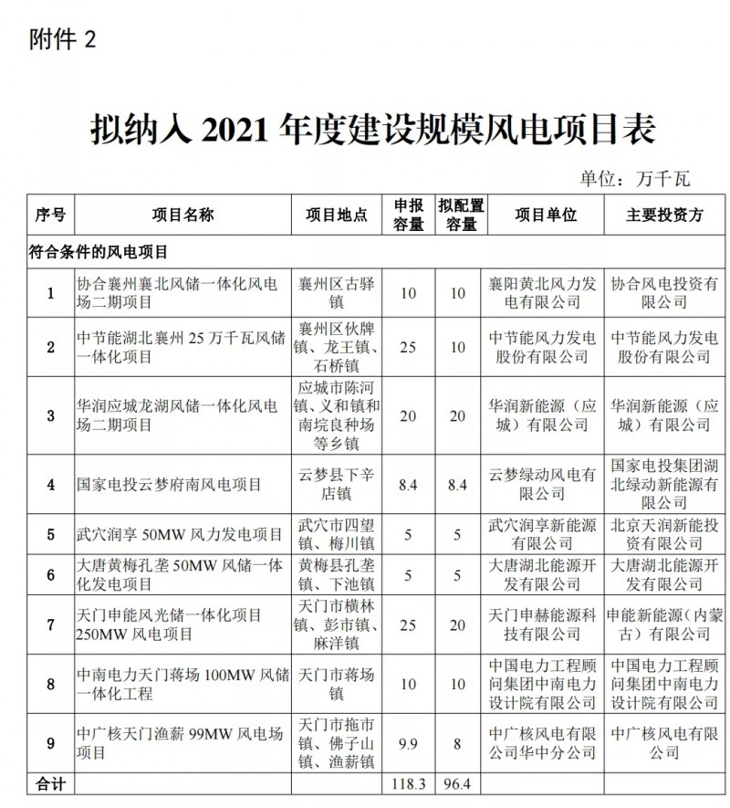 2)9個(gè)風(fēng)電項(xiàng)目,總規(guī)模118.3萬千瓦 ,擬配置規(guī)模96.4萬千瓦;