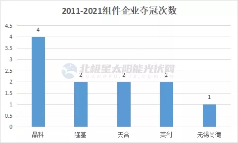 2011-2021年全球光伏組件出貨量NO.1幾易其主,據(jù)北極星太陽能光伏網(wǎng)梳理,晶科榮登寶座4次,天合奪冠2次,黑馬隆基于2020年超越晶科,奪得全球組件出貨第一的寶座,2021年大概率蟬聯(lián)冠軍。此外,無錫尚德登頂1次,英利登頂2次。