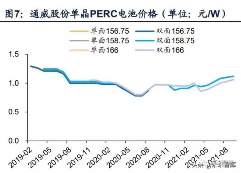 單雙面電池/組件幾乎同價,雙面增益滲透率不斷提升。根據(jù)Wind,通威股份PERC單雙面電池片報價已趨于一致。根據(jù)Solarzoom,一線廠商單雙面組件成交價差也在0.02元/W以內(nèi)。由于雙面組件背面發(fā)電增益帶來的性價比提升,滲透率正在快速提升,根據(jù)CPIA統(tǒng)計,雙面組件市場份額已從2018年的2%提升至2020年的30%,預(yù)計2025年有望達到60%以上。