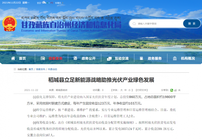 ⑶統(tǒng)籌收益分配。出臺《稻城縣村級光伏扶貧電站收益分配管理實施細則》,按照村級光伏扶貧電站發(fā)電收益形成村集體經(jīng)濟的原則分配收益。光伏電站并網(wǎng)以來,累計發(fā)電3857124千瓦時,累計收益289.28萬元,安置公益崗位167人。